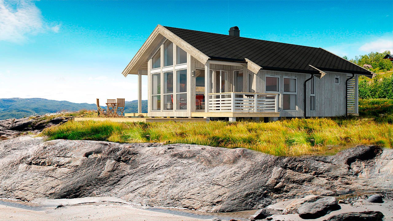 Lys og luft er ledetråden når vi designer nye Aurora-modeller. Aurora 940 er en modell-familie der vi har lyktes med det meste!Aurora 940A har stue og kjøkken med lysforhold helt utenom det vanlige. I tillegg til de store vinduene i fronten, har både kjøkkenkroken og sofagruppen på motsatt side fritt utsyn i hyttas lengderetning takket være en diskret karnapp-løsning. Hytta har to soverom og en stor hems som åpner seg mot stuedelen. Legg merke til trappa opp til hemsen, som er snedig skjult mellom gang og bad. På alle 940-modellene skaper sprangene i fasaden et spennende ytre som bidrar til å gjøre hytta mindre dominerende.